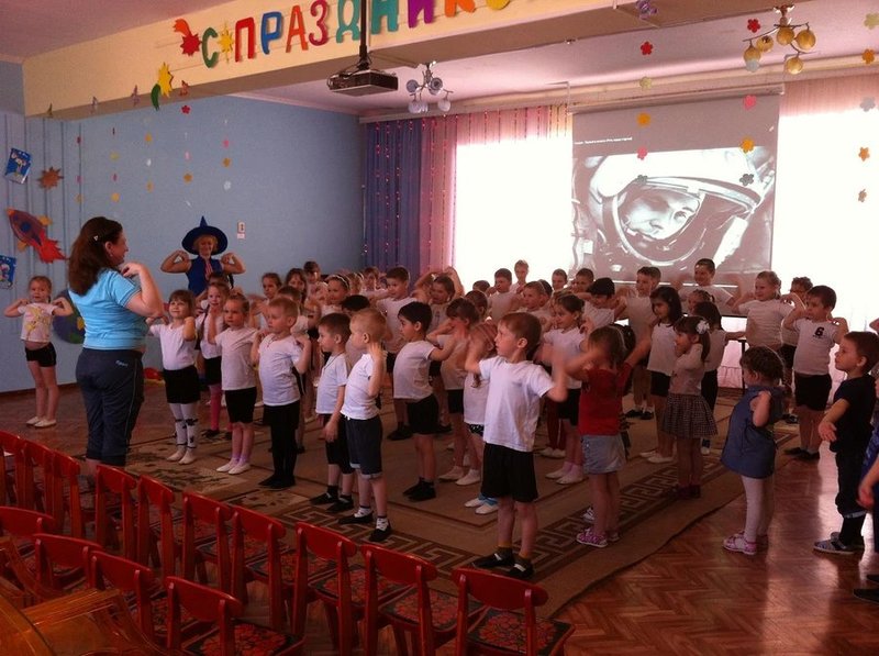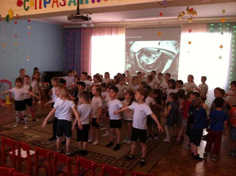 В старших группах проводились беседы о космосе, также дети рассматривали иллюстрации связанные с космосом и фотографии Юрия Гагарина - первого человека, побывавшего в космосе. Затем ребята и взрослые встретились в музыкальном зале детского сада, который ненадолго превратился в «космический кинозал». Ребята совершили «космическое путешествие» в прошлое: узнали историю появления первых космических кораблей и имена первых покорителей космоса, увидели, как выглядит Земля из космоса, узнали, что космонавтами могут быть не только мужчины, но и женщины. Затем ребята участвовали в «Космической эстафете», выполняя занимательные, но, порой, и сложные задания. Космос всегда был и остаётся всем интересен своими загадками, своими неизведанными далями, которые влекут всё человечество. Ведь не зря нам всем нравится смотреть на звёздное небо, наблюдать, как мимо звезд движутся спутники. Звёзды были и остаются верными друзьями для путешественников.Праздник прошел весело и интересно.