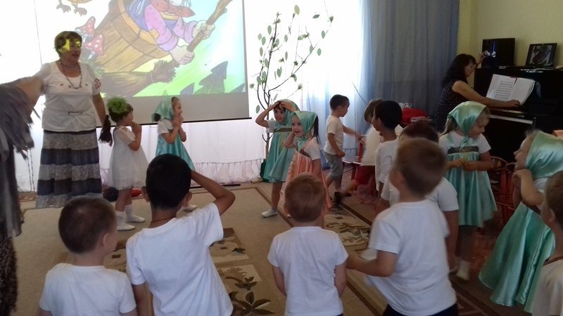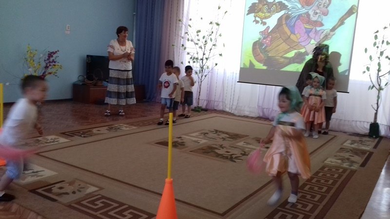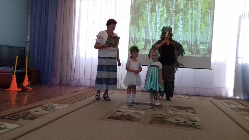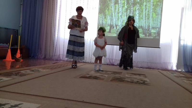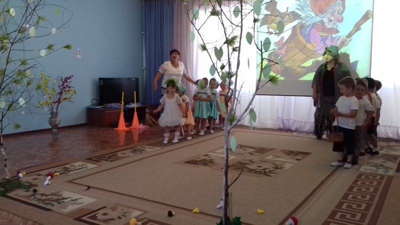 Пока ребята рассказывали стихи,пословицы и поговорки о березке, внезапно, на празднике появилася персонаж Бабы Яги, которая пыталась навредить березке. Ребята сразу же заметили её проказы и убедили её в том ,что этого делать нельзя.Они предложили Бабе Яге вместе сними поводить хороводы, поиграть в игры и посоревноваться.