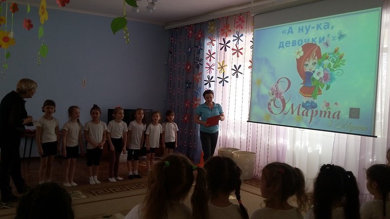 12 марта у нас в детском саду прошло музыкально-спортивное развлечение «А ну-ка, девочки!» в подготовительных группах «Колокольчики» и «Бусинки». Между собой соревновались девочки этих групп.