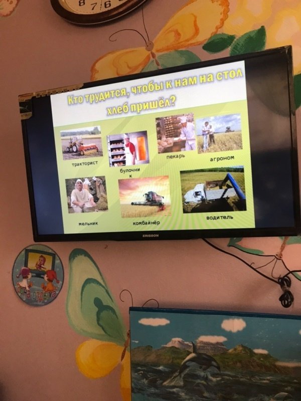 Вниманию детей была представлена презентация на тему «Хлеб всему голова». Пожалуй, это самая популярная пословица о хлебе. Дети закрепили свои знания просмотром слайдов, о людях различных профессий, которые заняты в этих сложных процессах. В заключение рассмотрели книги о том, как люди выращивают хлеб и посмотрели поучительный мультфильм «Про девочку, которая наступила на хлеб».