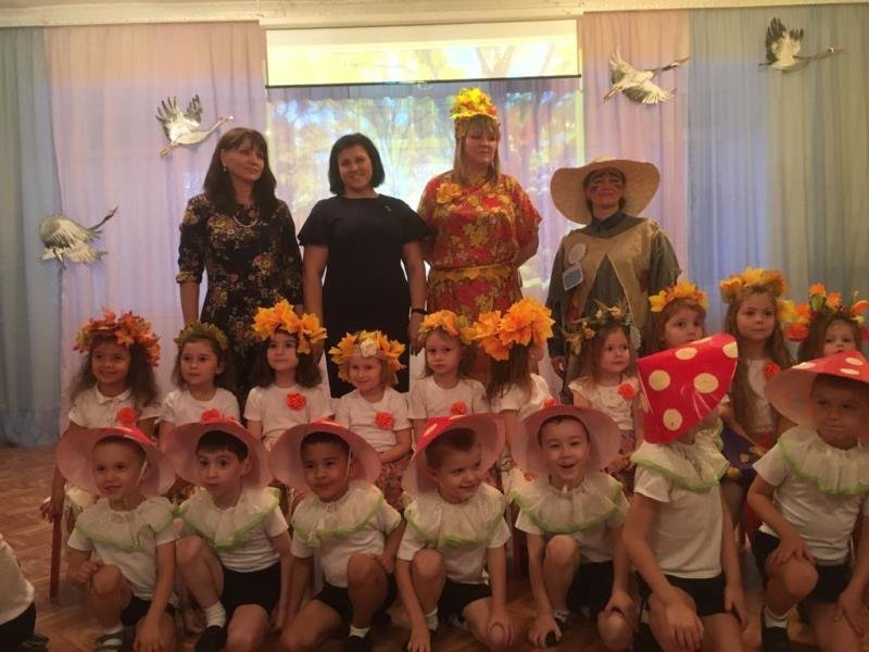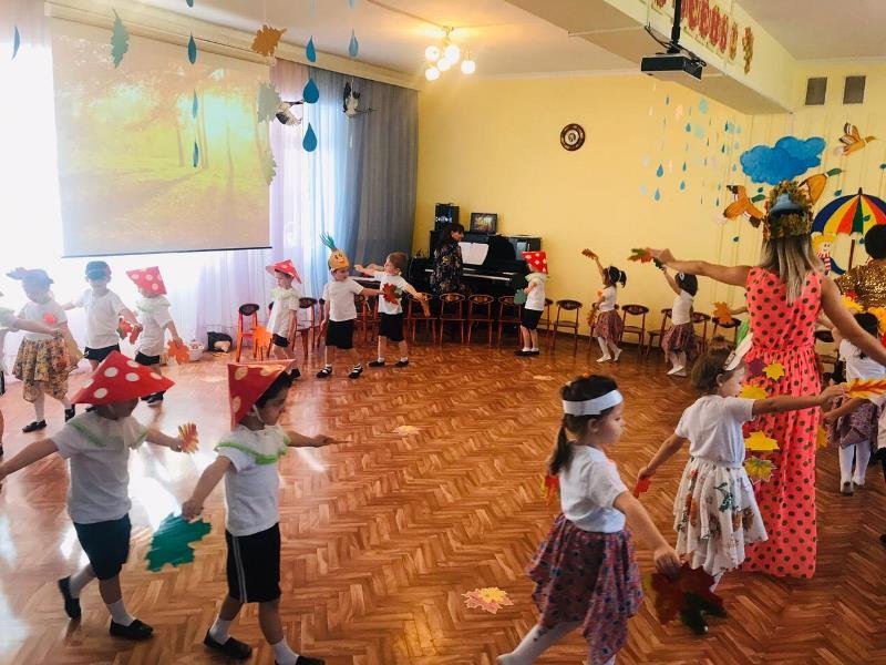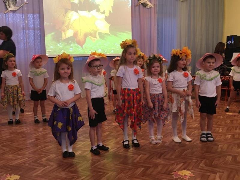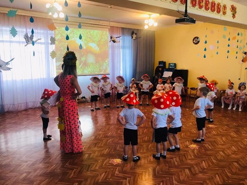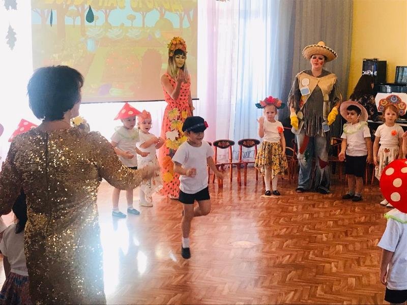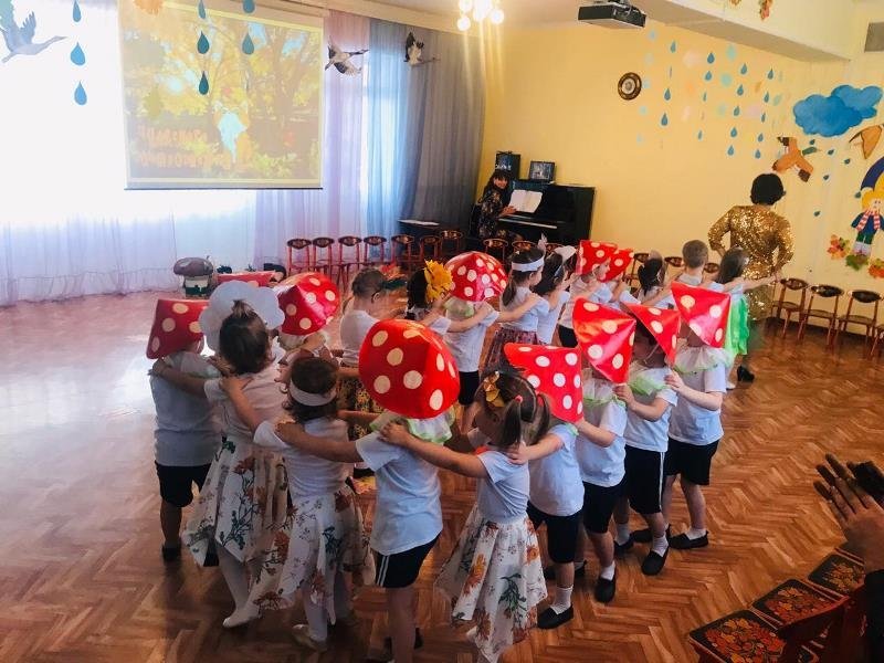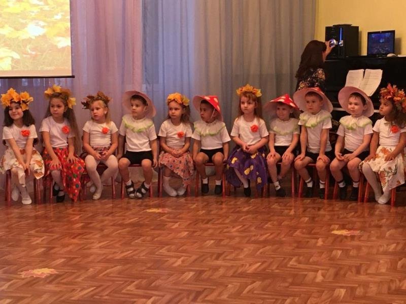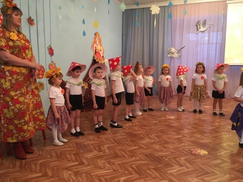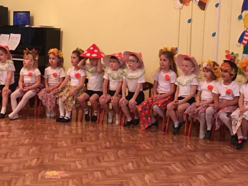 Мальчики исполнили для Осени озорной и задорный танец грибочков, а девочки весело танцевали с листочками.