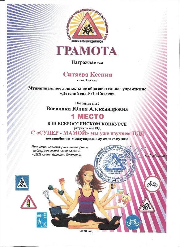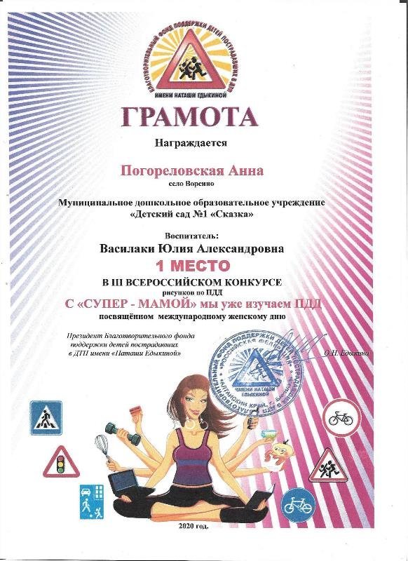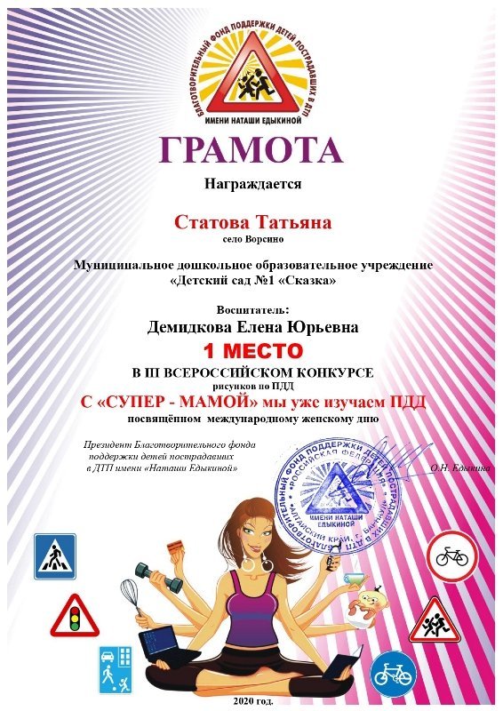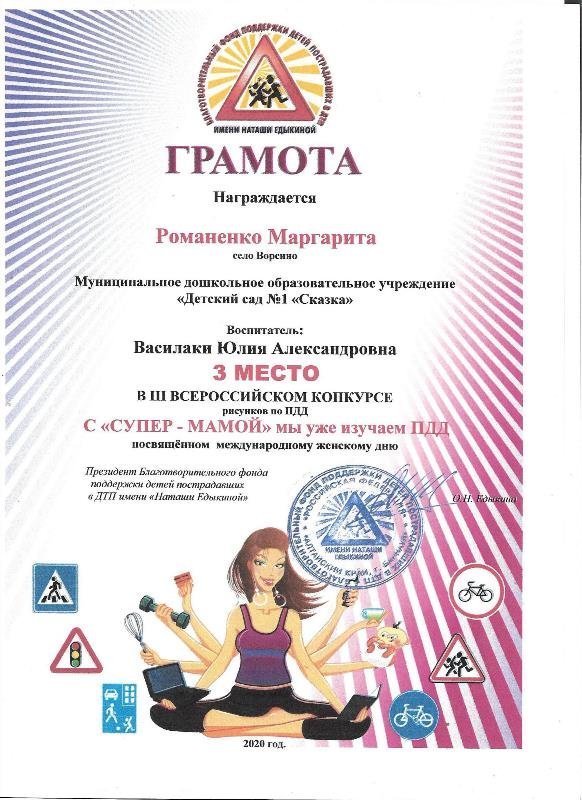 В марте 2020 года Благотворительный фонд проводил конкурс рисунков «С «СУПЕР - МАМОЙ» мы уже изучаем ПДД». Наши победители: Романенко Маргарита, Погореловская Анна, Статова Татьяна и Ситяева Ксения.
