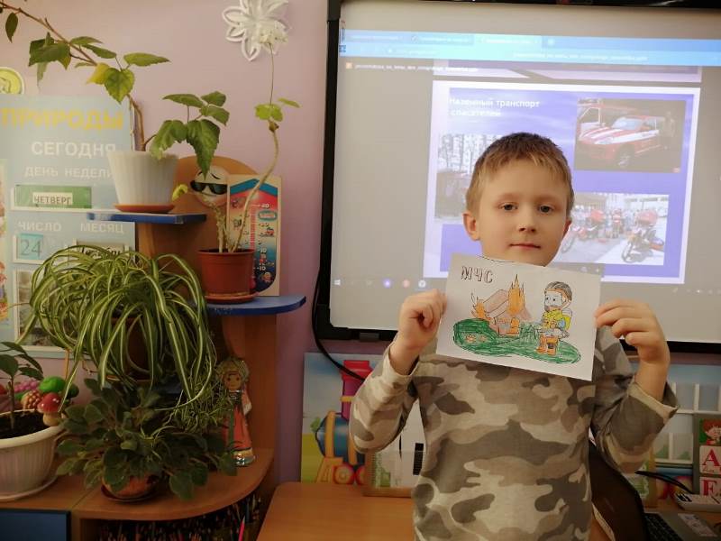 В МЧС России трудятся высококлассные специалисты, настоящие профессионалы своего дела, которые в сложных и опасных для жизни условиях помогают людям, пострадавшим в результате техногенных и природных катастроф. Пожарные, спасатели, водолазы, кинологи, летчики и многие другие специалисты МЧС России выполняют задачи по тушению пожаров, ликвидации чрезвычайных ситуаций, поиску и обезвреживанию боеприпасов Великой Отечественной войны, выезжают и оказывают помощь пострадавшим при дорожно-транспортных происшествиях и других бедствиях. Ребята подготовительной группы «Лесовичок» закрепили знания и узнали много нового о спасателях. Дети посмотрели презентацию «МЧС России», играли в сюжетно - ролевую игру «Спасатели», рисовали, рассказывали стихотворения, посвященные спасателям.