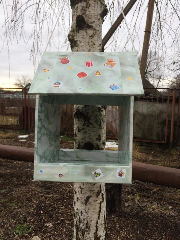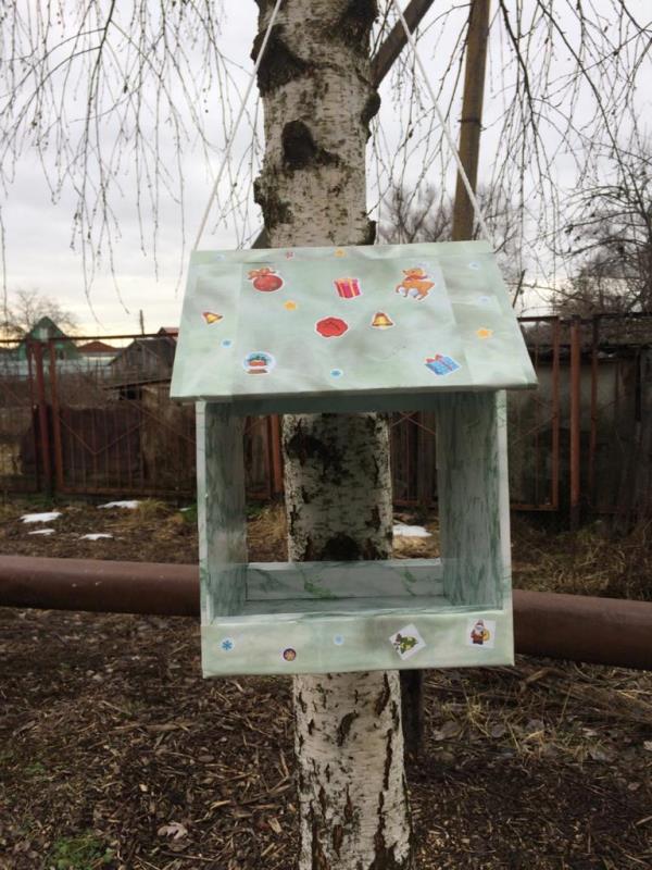 Цель: изготовление кормушек совместно с родителями, сбор корма для птиц, презентация и размещение кормушек на территории детского сада, организация дежурств в «Птичьей столовой».
