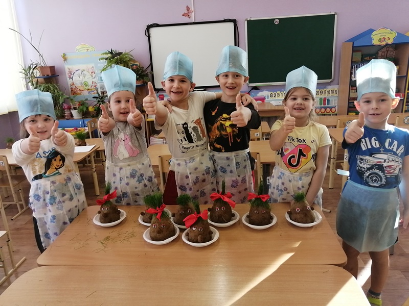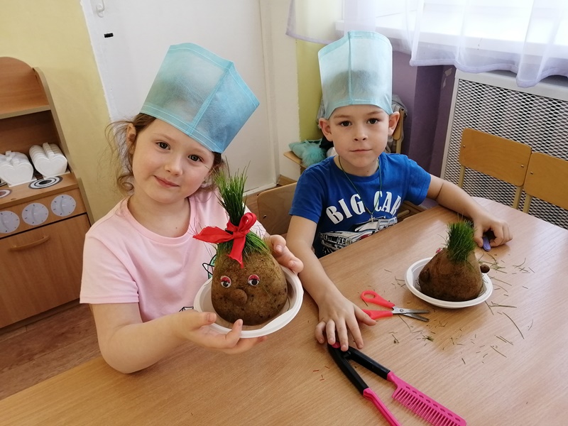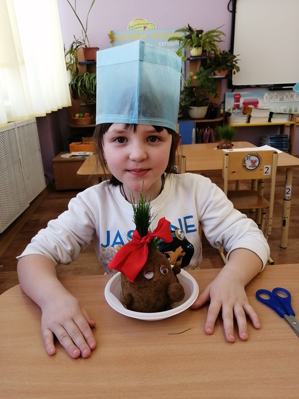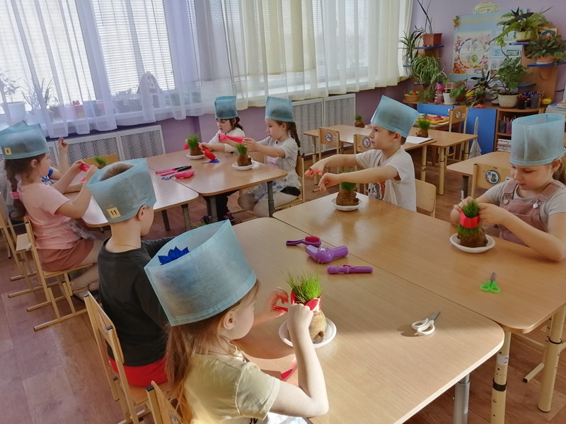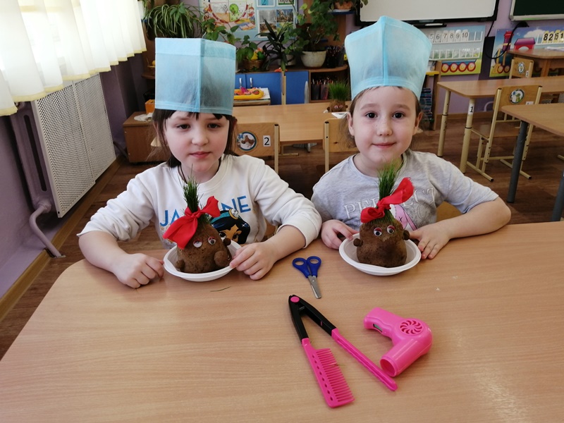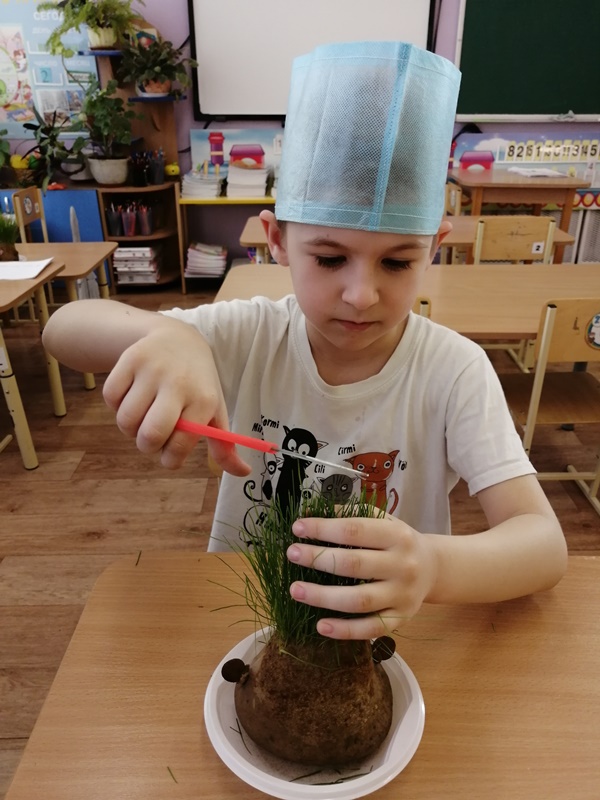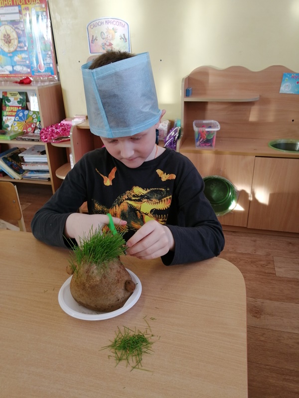 Ежедневно поливая "Травянчика", чтобы семена проросли, дружно наблюдали за происходящими изменениями. На пятый день семена проросли, появились первые росточки, а через десять дней — зеленые ростки. Через пятнадцать дней газонная трава выросла до шести сантиметров, а на двадцатый день мы с детьми приняли решение сделать нашим "Травянчикам" прически, на мгновение стать парикмахерами. Мальчики решили сделать стрижки, а девочки украсили прически своим "Травянчикам" алыми ленточками.