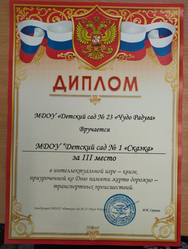 Ребята заняли III место в интеллектуальной игре-квизе, приуроченной ко Дню памяти жертв дорожно-транспортных происшествий, которая прошла 18 ноября в МДОУ "Детский сад №23 "Чудо Радуга".