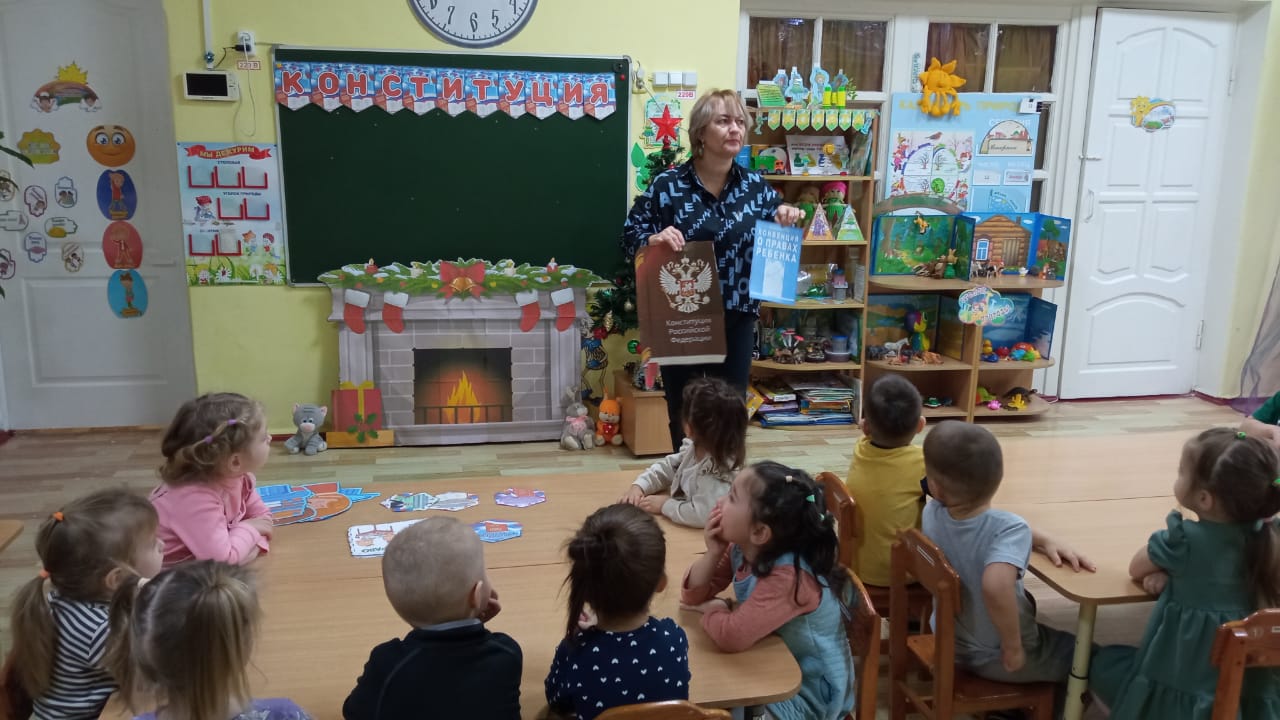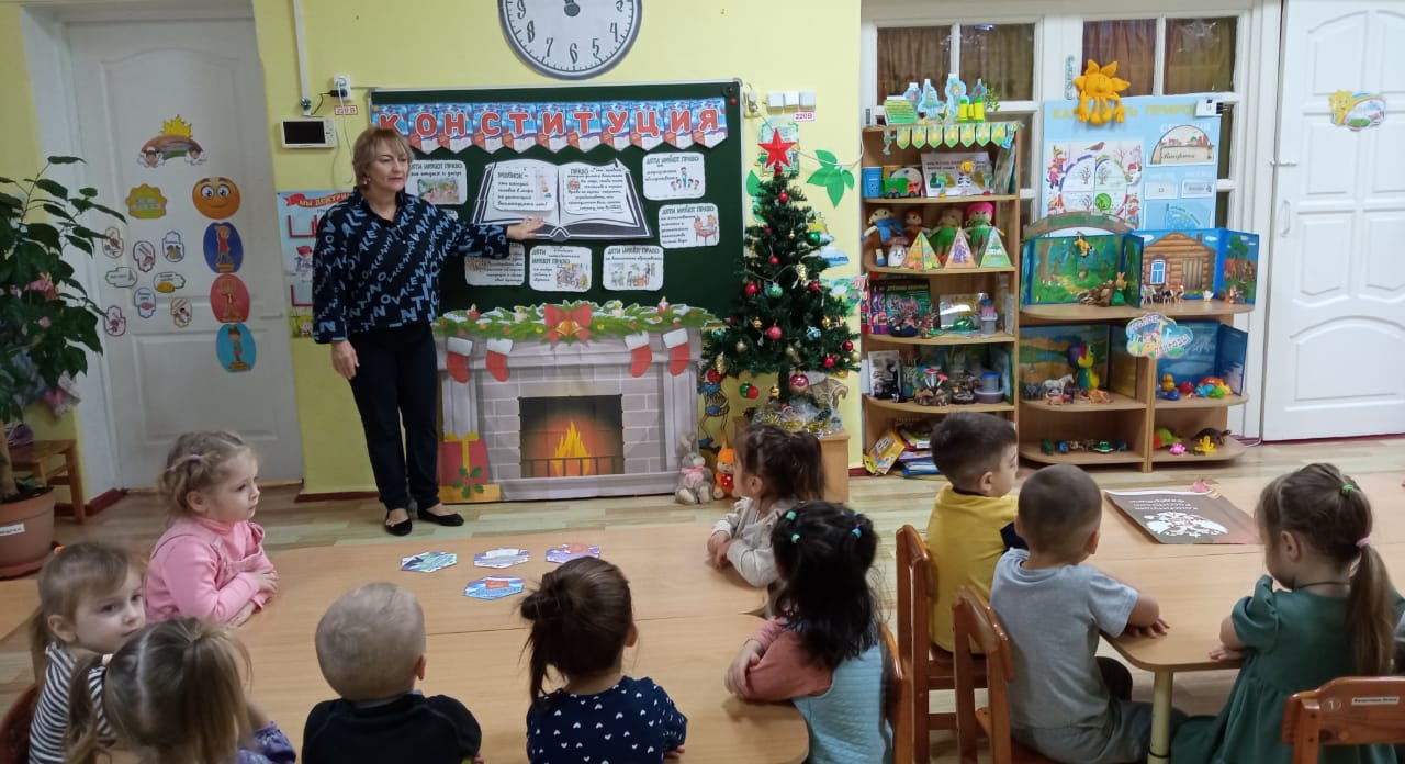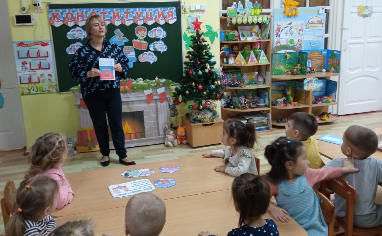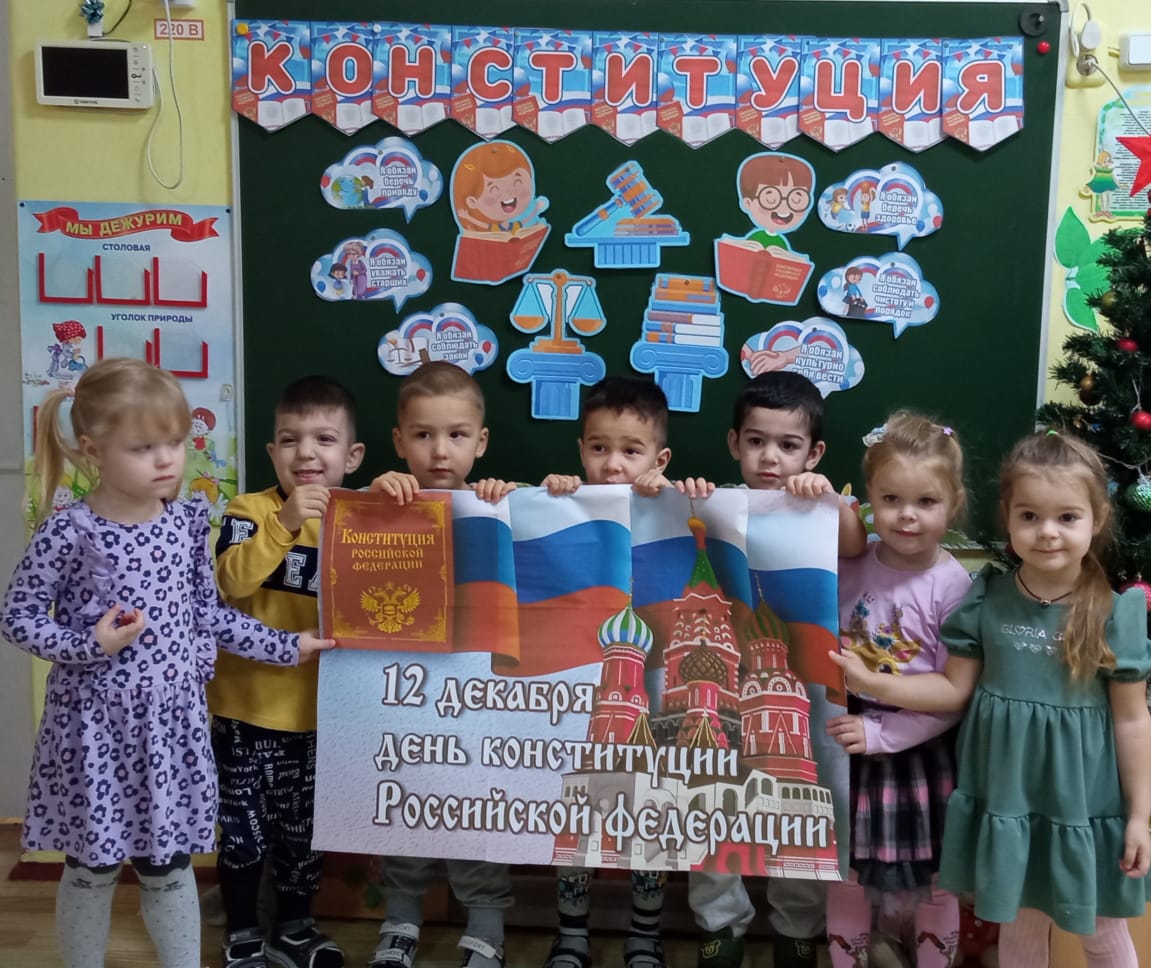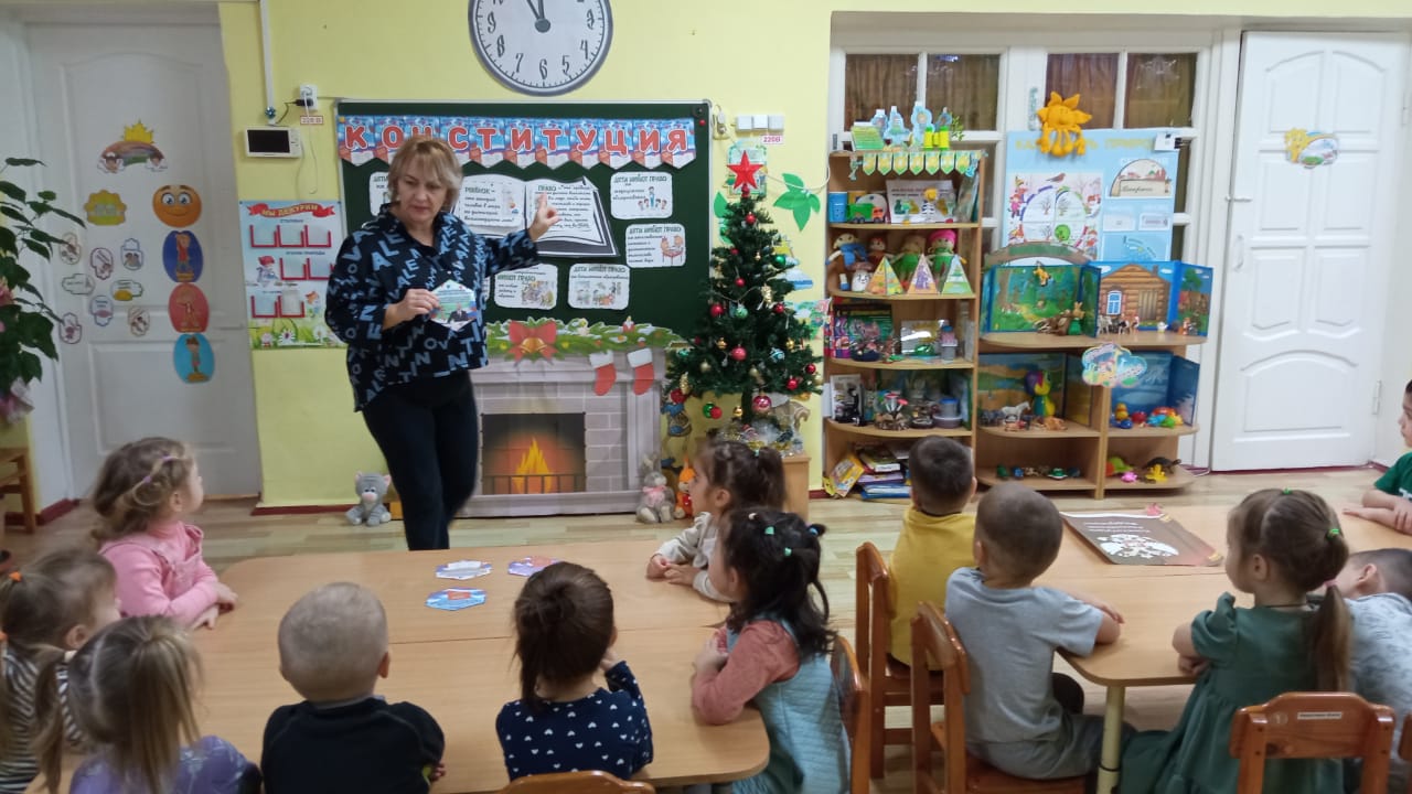 В День Конституции РФ ребята из групп "Лесовички" и "Солнышко" познакомились с понятием "закон", "порядок", "право", повторили государственную символику: гимн, флаг, герб.